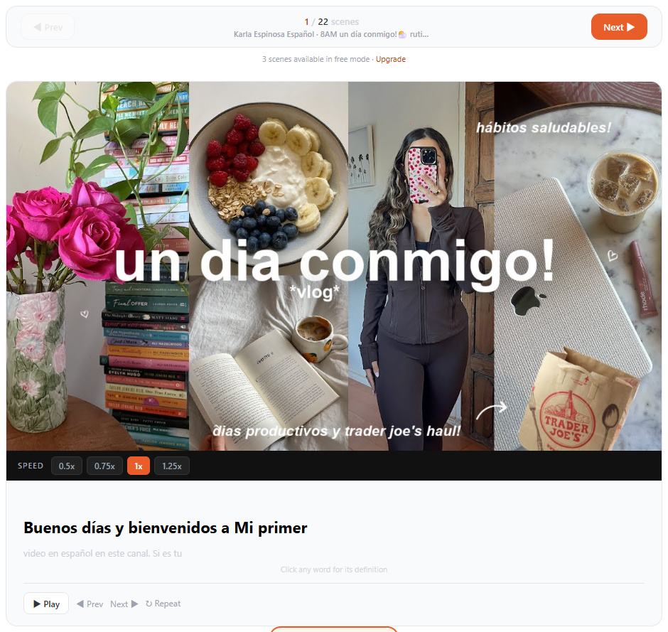Vloglish is an English-learning platform that lets users search and watch subtitle scenes from YouTube vlogs, practice pronunciation, save vocabulary, and take quizzes. We offer both free and paid subscription tiers (Pro and Max).
